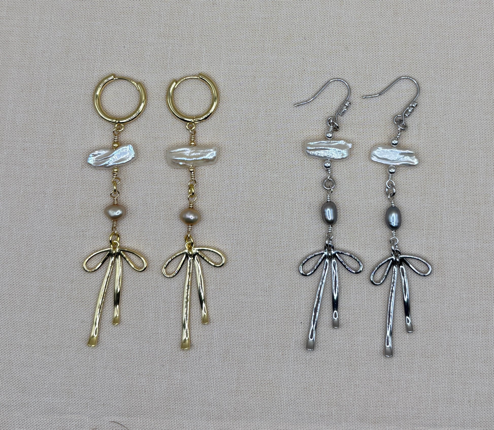 Elevate your look with these elegant, ultra feminine earrings featuring a bow charm paired with unique freshwater pearls. Each pair combines modern charm with timeless grace, perfect for brides, special occasions, or adding a soft romantic touch to any outfit.