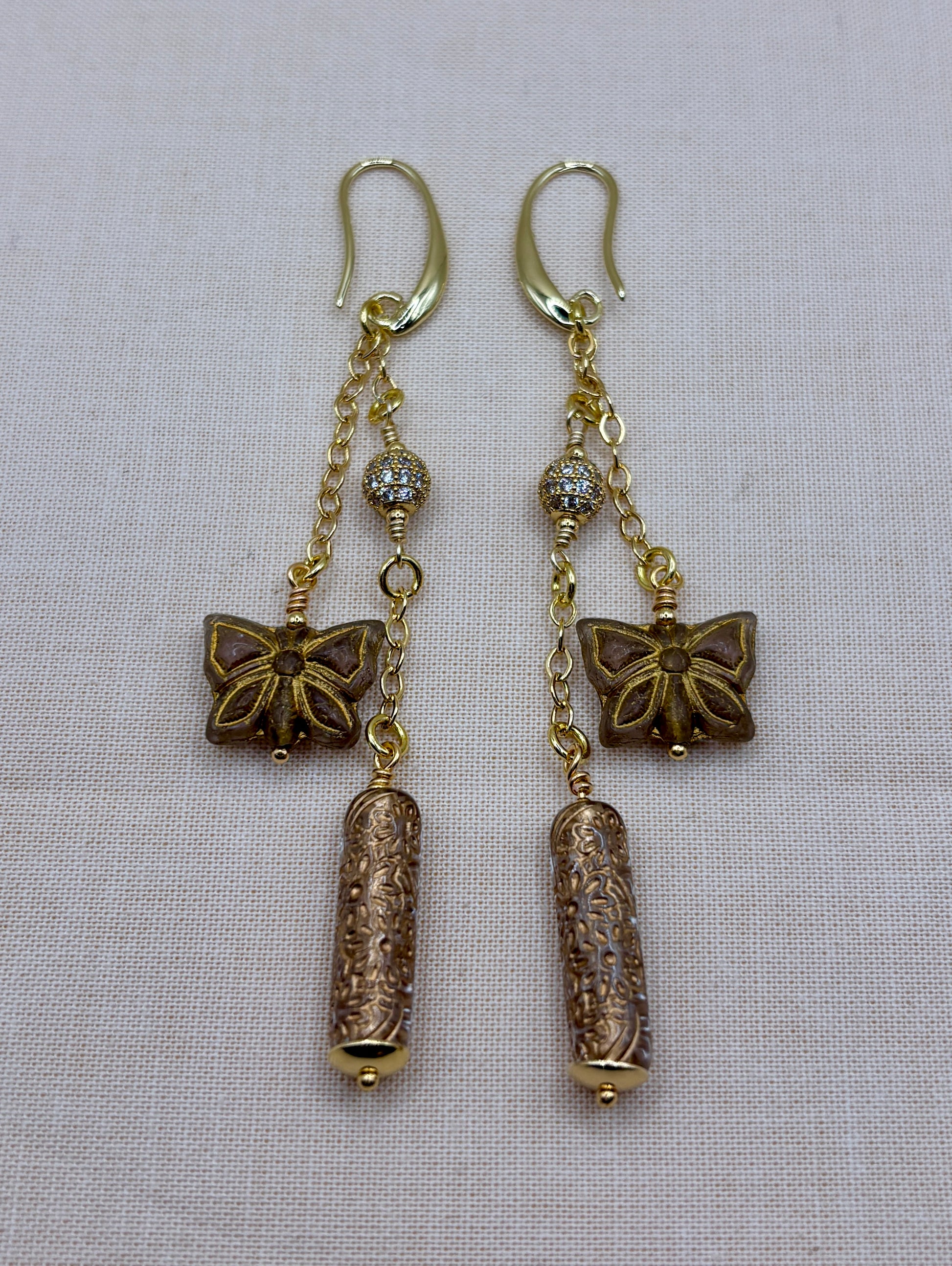 Handmade gold-tone drop earrings featuring a delicate Czech glass butterfly charm, CZ ball accent, and embossed antique cylinder bead. Lightweight, elegant, and perfect for gifting or adding a touch of sparkle to any look.